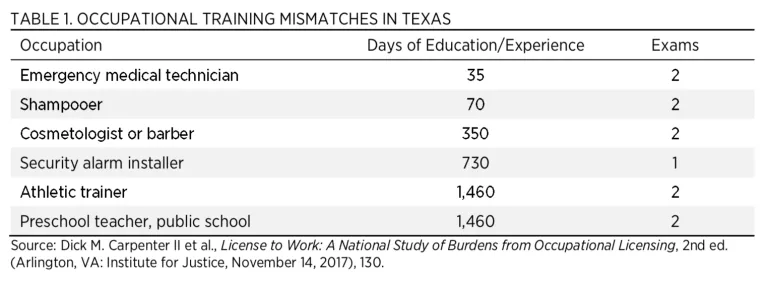Licensure is often arbitrary. As shown in table 1, licensing requirements often don’t match the risk posed to the public by certain professions. Compared with emergency medical technicians, aspiring barbers in Texas must undergo 10 times as many months of training; would-be security alarm installers (who are unlicensed in 36 states) must complete more than 20 times as much training; and athletic trainers must complete more than 40 times as much training.