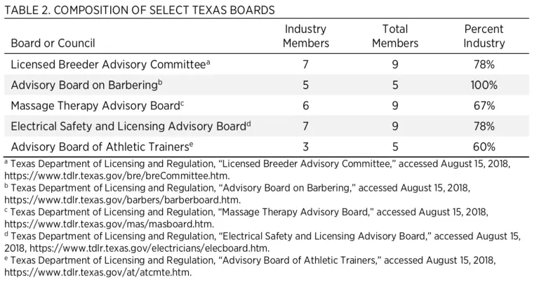 Licensing boards are dominated by members of the professions they oversee. About three-quarters (73 percent) of Texas occupational licensure boards are required by law to have a majority of their members work in the professions they oversee. See table 2 for board composition data in a sample of Texas boards. Owing to vacancies, many boards are composed entirely of industry insiders. This presents a legal concern in light of the US Supreme Court’s decision in North Carolina State Board of Dental Examiners v. FTC, which held that states may be liable for antitrust violations when boards are dominated by members of the professions they oversee and when elected officials fail to actively supervise these boards. It also creates a practical concern that boards will tend to act as industry cartels, controlling entry of new members rather than ensuring public safety.