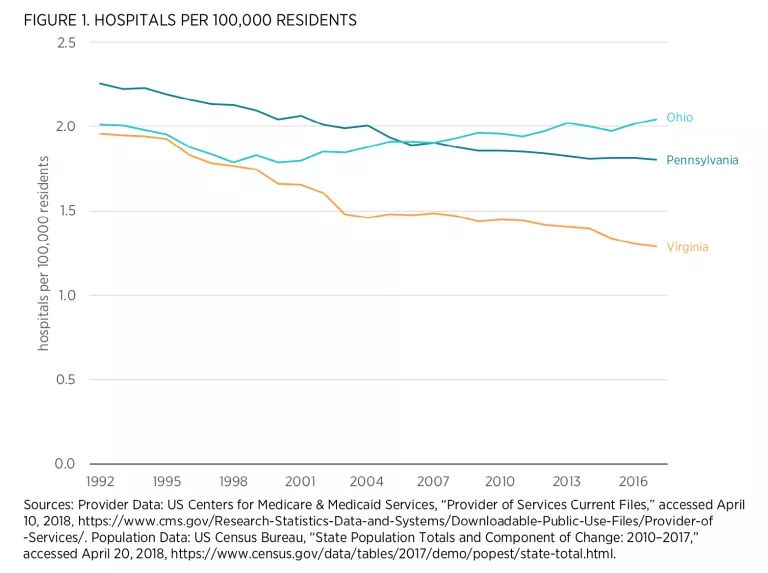 Figure 1 shows hospitals per 100,000 residents. In Ohio, the number of hospitals per 100,000 residents rose slightly. Over the same period, in both Virginia and Pennsylvania, the number has fallen. In Virginia, however, the decline was sharper, falling 34 percent, compared with a 20 percent decline in Pennsylvania. On a per-resident basis, Virginia now has seven-tenths as many hospitals as Pennsylvania and a little more than six-tenths as many as Ohio.