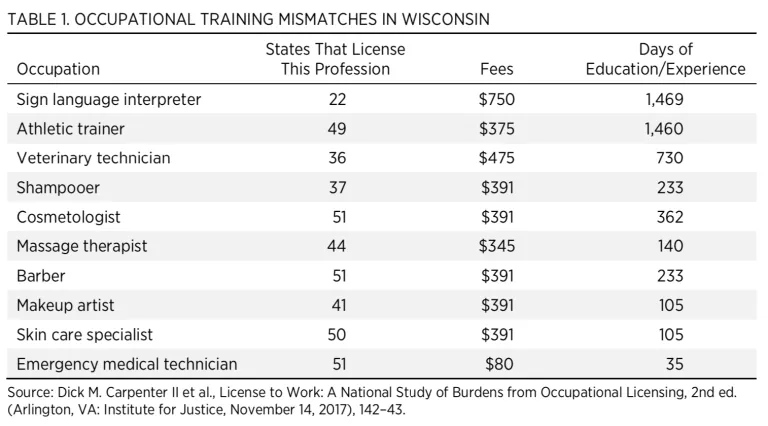Aspiring entrants to a large number of professions—ranging from travel guide and taxidermist to cosmetologist—are now required by the state of Wisconsin to obtain a government-issued license to work. It can take months and hundreds or even thousands of dollars to obtain these licenses. Among 42 low- to moderate-income occupations licensed by Wisconsin, the average aspiring worker is required to spend 214 days in training and pay $259 in fees before he or she may obtain a license. These fees do not include either the cost of the education or the income that people forgo when they spend months in often-unnecessary training. According to the Institute for Justice, Wisconsin’s licensing laws are the 36th most broad and onerous in the country.