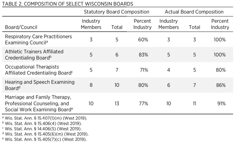 Licensing boards are often dominated by members of the professions they oversee. Ninety-three percent of Wisconsin occupational licensure boards are required by law to have a majority of their members work in the professions they oversee. See table 2 for board composition data in a sample of Wisconsin boards. Owing to vacancies or a lack of specificity, some boards may be composed entirely of industry insiders, while on other boards, industry insiders have a governing majority. This presents a legal concern in light of the US Supreme Court’s decision in North Carolina State Board of Dental Examiners v. FTC, which held that states may be liable for antitrust violations when boards are dominated by members of the professions they oversee and when elected officials fail to actively supervise these boards. It also creates a practical concern that boards will tend to act as industry cartels, controlling entry of new members rather than ensuring public safety.