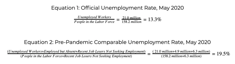 When the 4.9 million workers likely misclassified as “employed, but absent from work” and the 6.3 million workers who seem to have left the labor market are included in the unemployment rate, it rises to around 19.5 percent for May (see equation 2). I call this the “pre-pandemic comparable unemployment rate” because it’s comparable with labor market conditions in February before the COVID-19 recession began. Although this revised unemployment rate is still high, it’s an improvement over the 23.5 percent level reached in April.