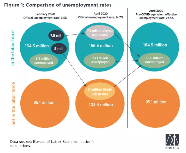Adding these 8 million people who were counted as having left the labor force increases the group of those considered “effectively unemployed” to 38.6 million. This produces a pre-coronavirus comparable effective unemployment rate of 23.5 percent. See Figure 1 for a graphical representation of this unemployment rate.