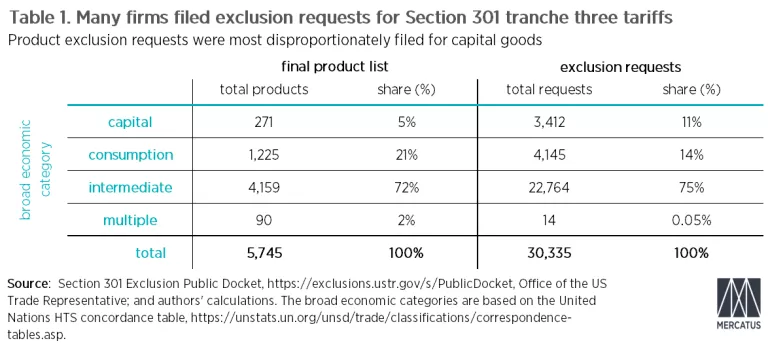 Table 1 reports the breakdown of the final list of products on which a tariff was imposed and exclusion requests for tranche three by broad economic category. The totals refer to the total number of products on which a tariff was imposed and to the total number of exclusion requests received. For some products with a tariff, multiple firms asked for an exclusion.