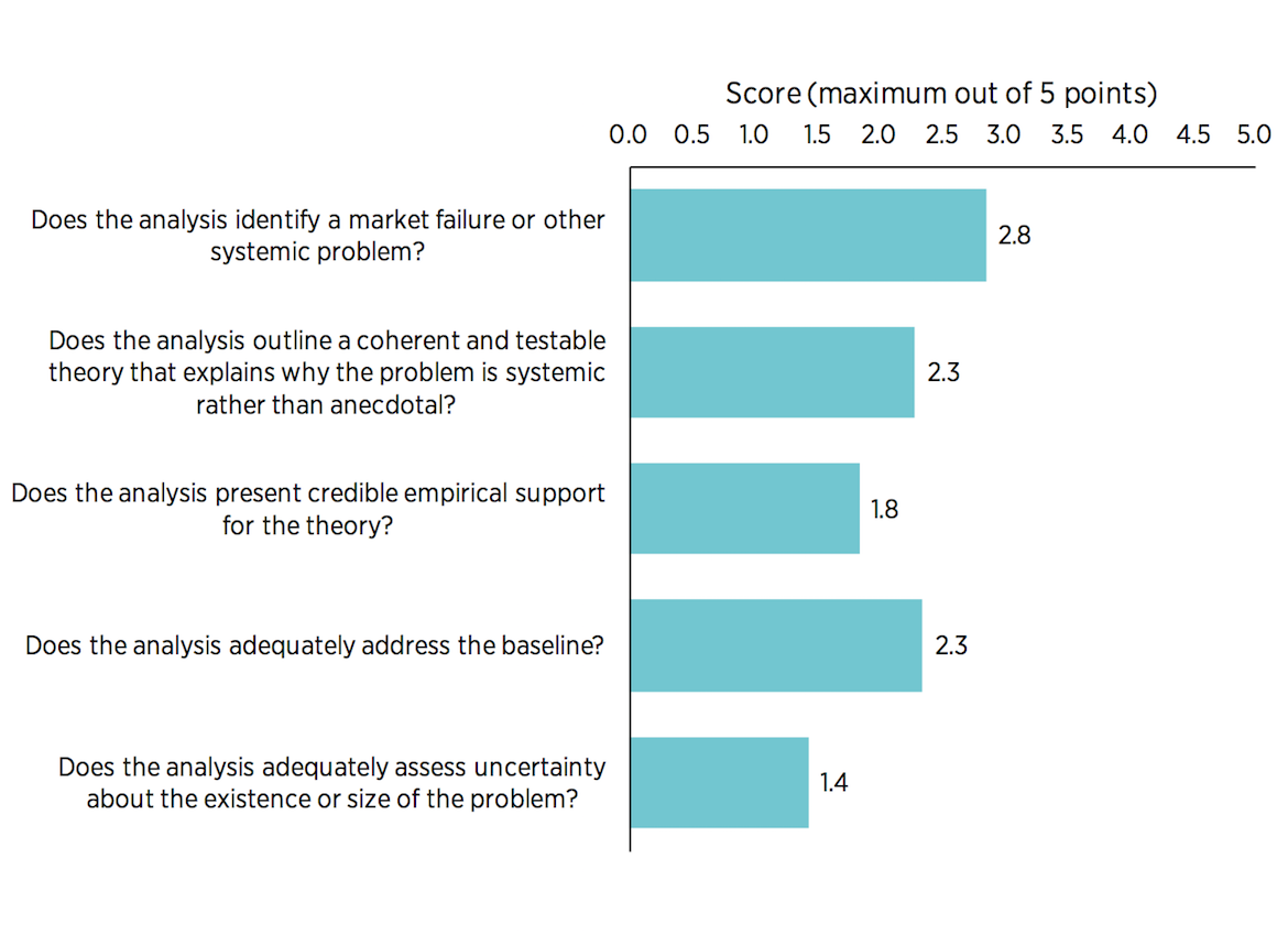 The average overall score for identifying a systemic problem was 2.2 out of 5 points. This is under 50 percent—a failing grade by most standards. No regulation has ever received an overall score of 5 based on these five criteria. In fact, 37 out of the 130 regulations examined received a rating of 0 or 1 on this question. This means the regulatory analysis had little or no content assessing the systemic problem at all, in spite of a clear directive in Executive Order 12866. Instead of assessing systemic problems, many notices of proposed rulemaking or their accompanying RIAs merely cite the statute that gives the agency authority to issue the regulation. But citing a statute is far from defining and analyzing a problem.