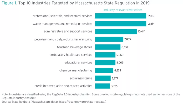 Researchers at the Mercatus Center at George Mason University developed State RegData, a platform for analyzing and quantifying state regulatory text. State RegData captures information in minutes that would take hours, weeks, or even years to obtain by reading and counting. For example, the tool allows researchers to identify the industries that state regulation targets most by connecting text relevant to those industries with restrictive word counts. These regulatory restrictions are instances of the words and phrases shall, must, may not, prohibited, and required, and they can signify legal constraints and obligations. As shown in figure 1, the three industries with the highest estimates of industry-relevant restrictions in the 2019 CMR are professional, scientific, and technical services (which includes legal services, accounting and tax preparation, and a variety of other professional services); waste management and remediation services; and administrative and support services.