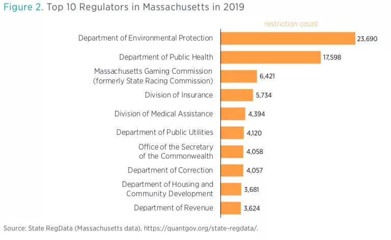 The sections in the CMR are organized by the department that oversees particular rules. Figure 2 shows that rules from the Department of Environmental Protection contain 23,690 restrictions. By this measure, this department is the biggest regulator in Massachusetts. Coming in second is the Department of Public Health, with 17,598 restrictions.