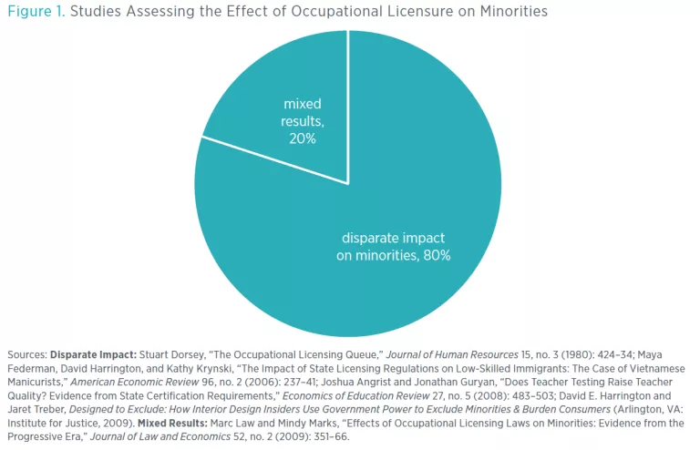 All potential workers entering a licensed profession face the same restrictions, but occupational licensing tends to impact certain populations more than others. These barriers to employment are particularly steep for lower-skilled, lower-educated populations; for immigrants; for non-English speakers; for those with criminal records; and for those who move frequently, such as military spouses. In fact, as shown in figure 1, 80 percent of studies reviewed by scholars at the Mercatus Center at George Mason University find that licensure harms minorities. Researchers also find that measured income inequality is greater in countries with more barriers to entry. And in those states in which licensure of low- to moderate-income occupations has grown the most, individuals raised in relatively low-income households are less likely to move up the income distribution.