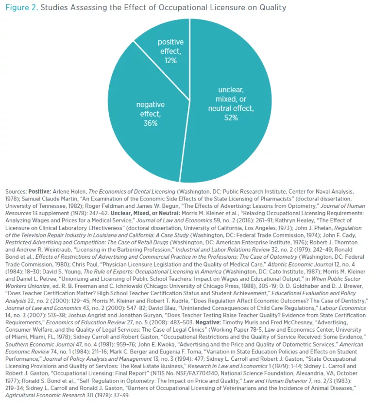 Because the economic theory is ambiguous, one must turn to the data. In figure 2 we present a survey of the empirical work on licensure and quality. Most studies find that licensure has mixed, unclear, or neutral effects on quality. Interestingly, however, more studies find a negative effect of licensure on quality than find a positive effect.